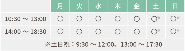 平日10:30〜18:30 ※土日祝 9:30〜17:30